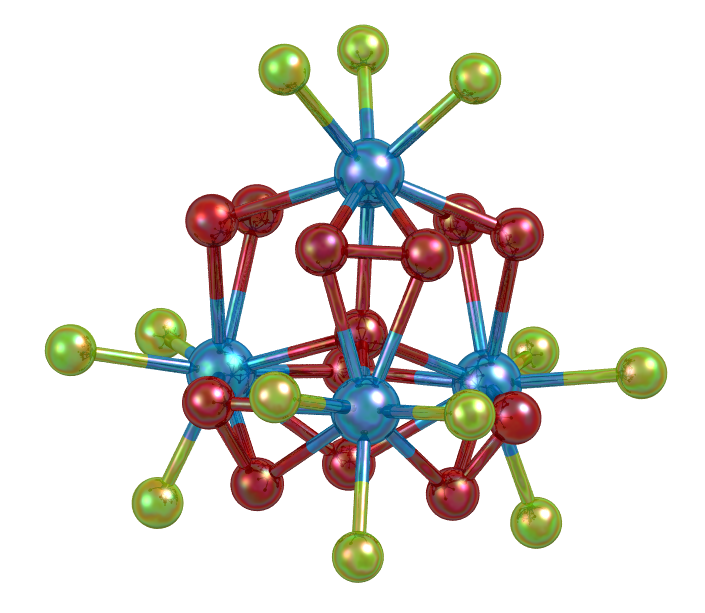 Image showing the tetranuclear protactinium peroxo-cluster [Pa4O(O2)6F12]6- in A6[Pa4O(O2)6F12] where A = Rb+, Cs+, (CH3)4N+